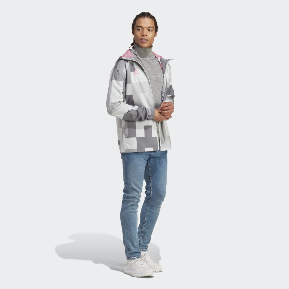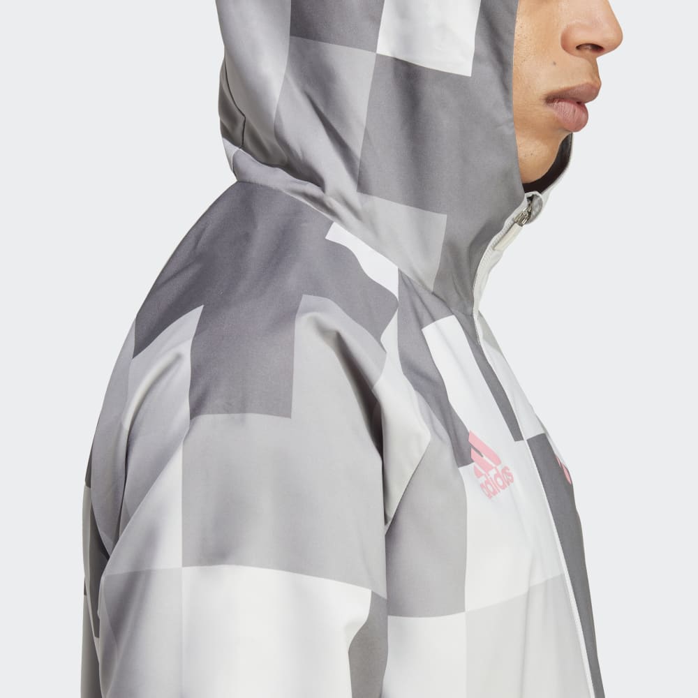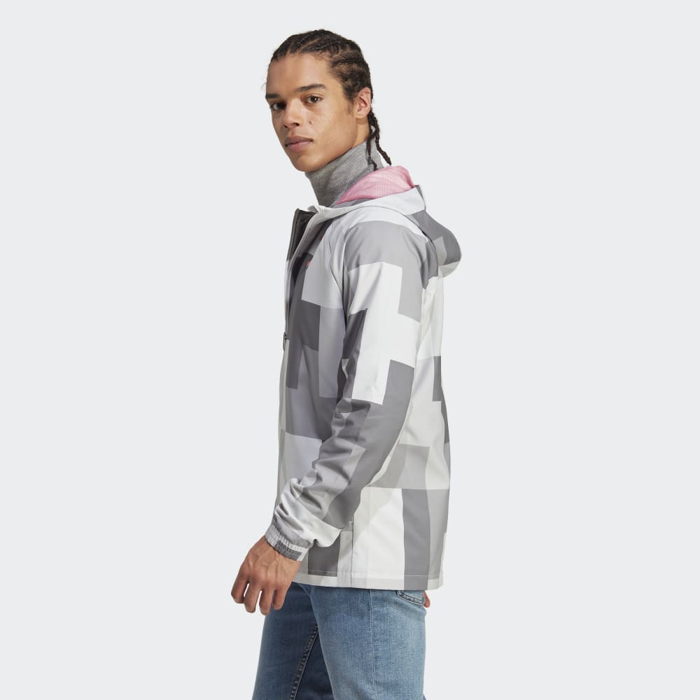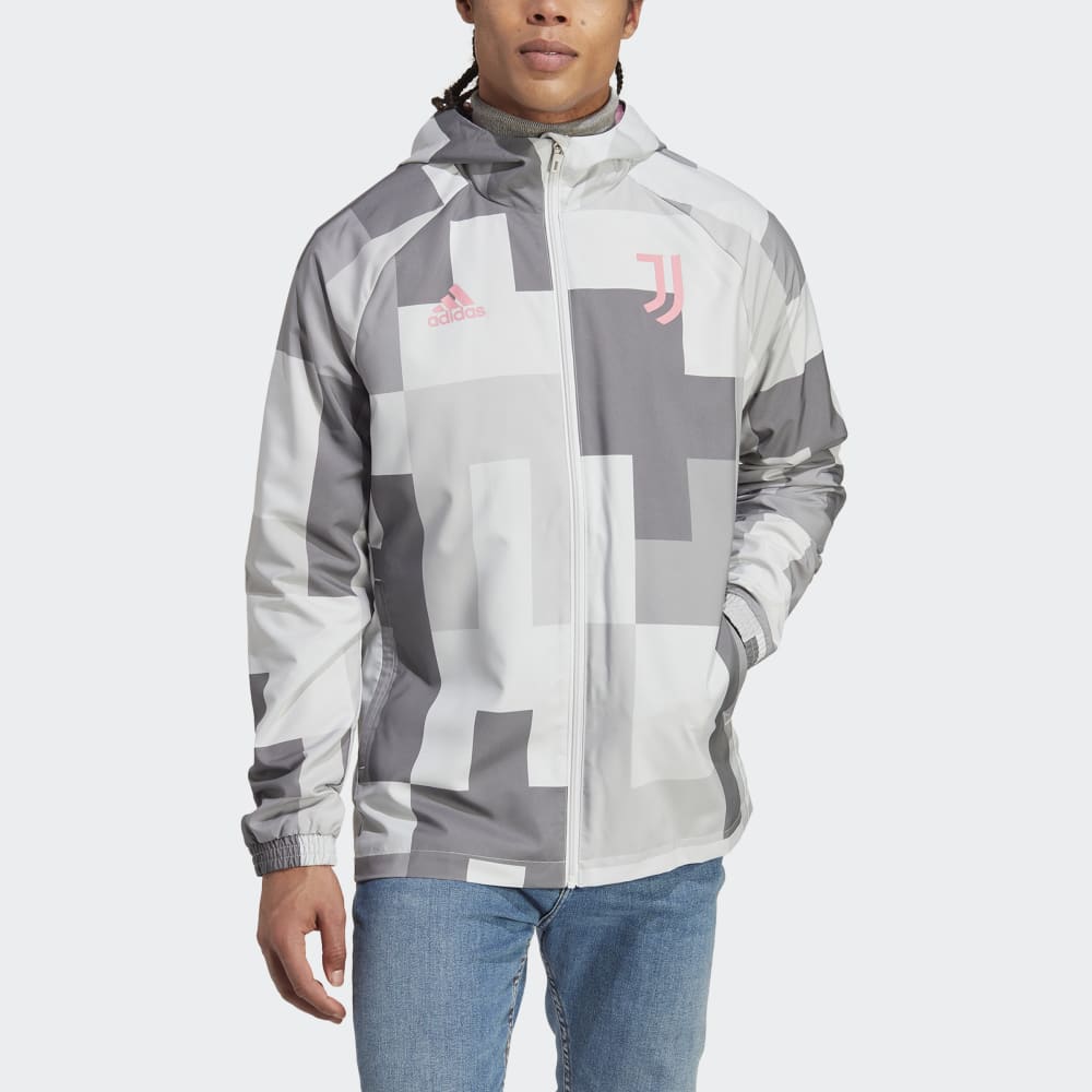 Take shelter in an adidas windbreaker inspired by Juventus' home. That bold, blocky graphic will be familiar to anyone who's taken a stroll around the exterior of the Allianz Stadium. Once on, this jacket's slim fit and tough woven shell will keep you plowing ahead on breezy days. Standing out on the chest, a vibrant team badge carries your soccer pride.