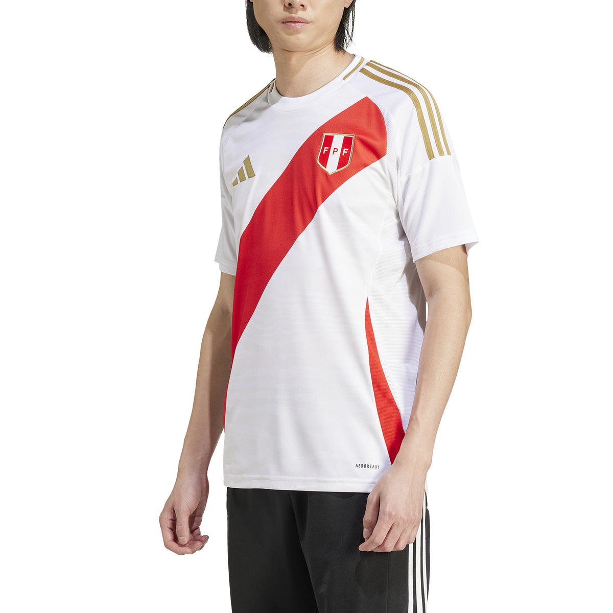 A classic soccer look and a design steeped in Peruvian musical tradition. Behind that familiar red sash, the white base of this adidas Peru home jersey comes alive with a wood grain effect borrowed from a traditional Peruvian Cajon. Mesh panels and moisture-managing AEROREADY keep players and fans focused. A woven badge sings with national pride. This product is made with 100% recycled materials. By reusing materials that have already been created, we help to reduce waste and our reliance on finite resources and reduce the footprint of the products we make.