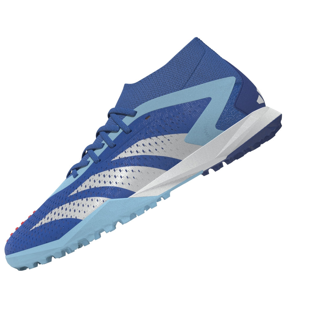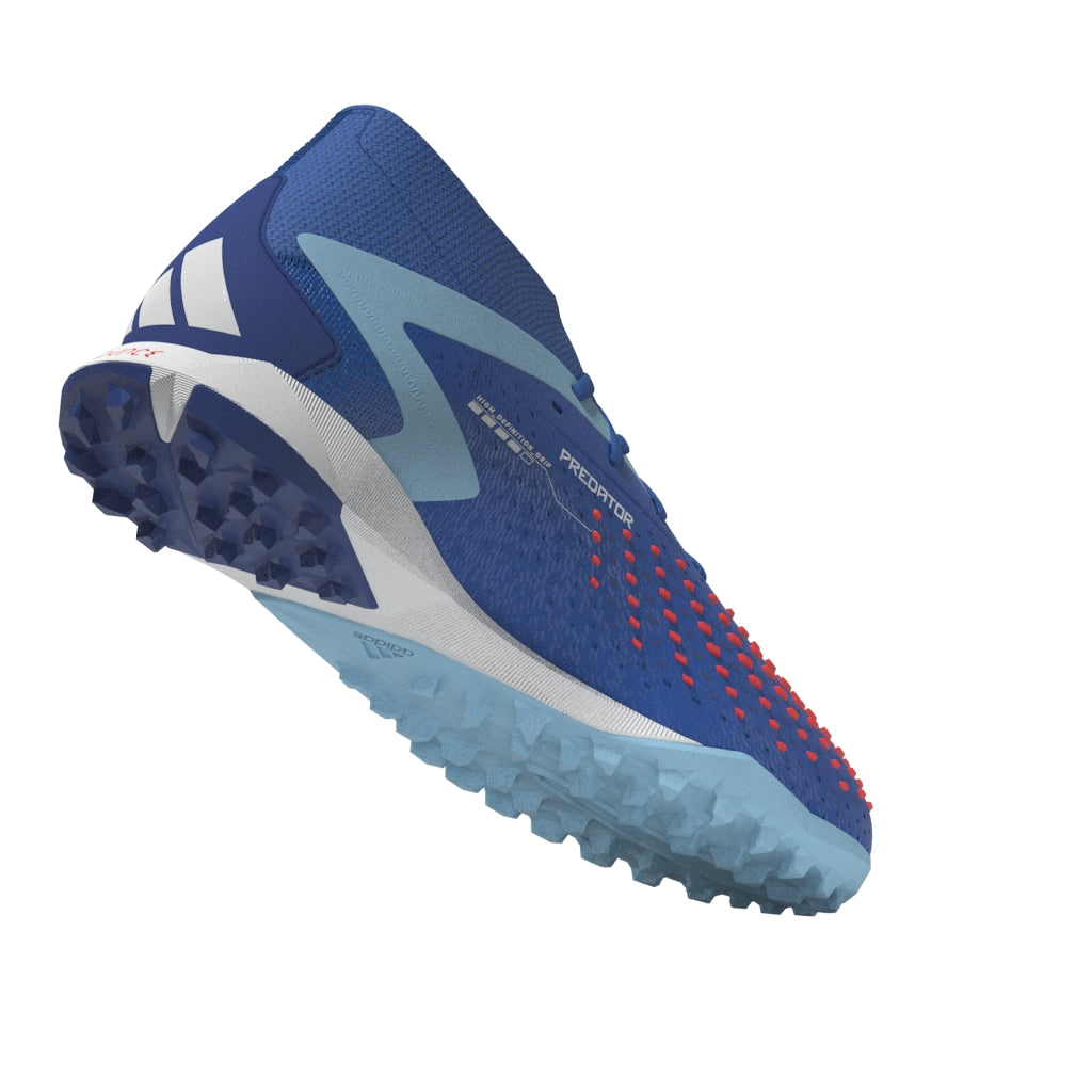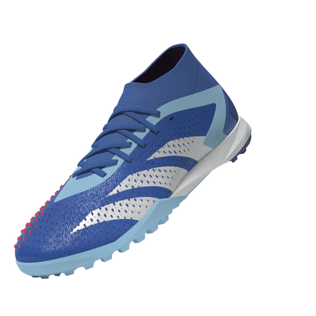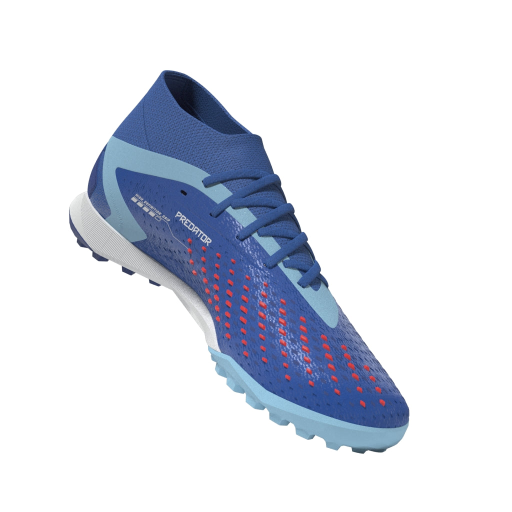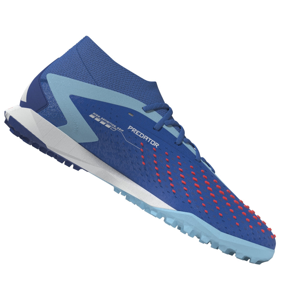 Top corner. Bottom corner. All the corners. adidas Predator Accuracy is crafted for goalscoring, so you know the ball will find the net. The fun's in choosing how it gets there. These soccer shoes have a soft HybridTouch upper with High Definition Grip rubber elements that deliver biting grip on the ball without compromising forefoot flexibility. A Bounce midsole and lug rubber outsole keep you comfortable and stable on artificial turf. Made with a series of recycled materials, this upper features at least 50% recycled content. This product represents just one of our solutions to help end plastic waste.