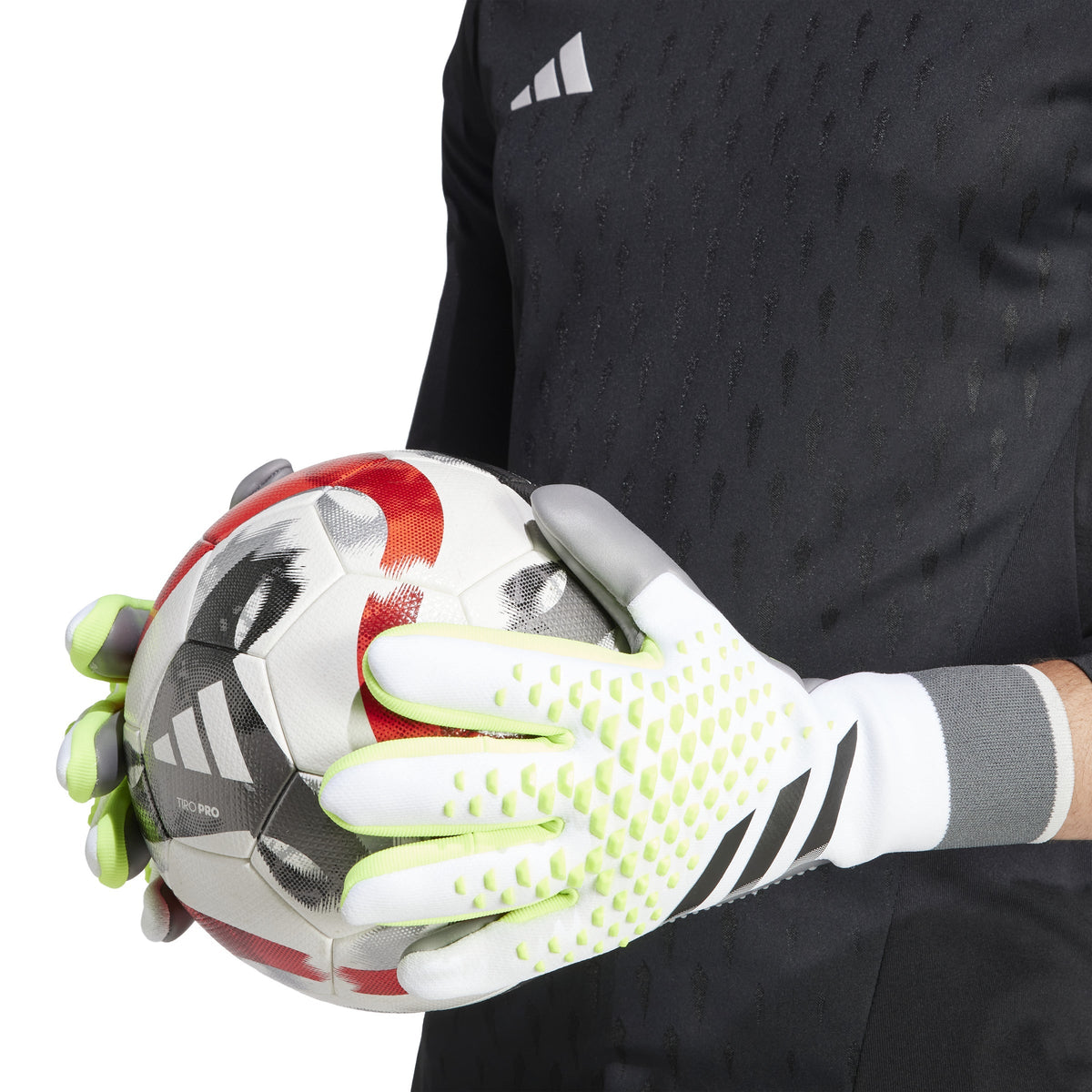 Target pinpoint punching and flawless ball handling in these strapless Predator goalkeeper gloves from adidas. Silicone High Definition Grip elements on their knit backhand ensure precise clearances without sacrificing flexibility. The URG 2.0 palm includes a thumb wrap for extended grip and an abrasion zone to guard against wear when getting up from dives. A minimum of 50% of this product is a blend of recycled and renewable materials.