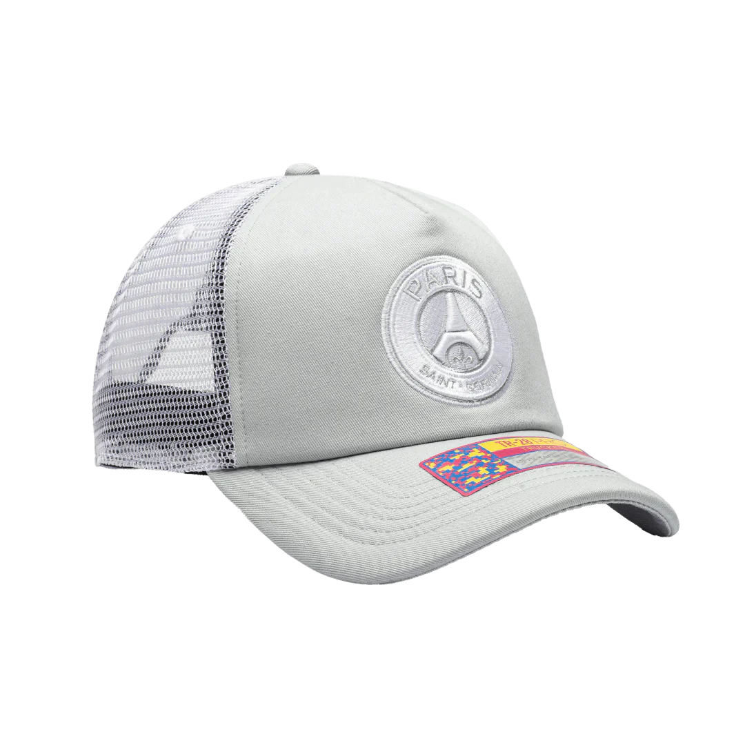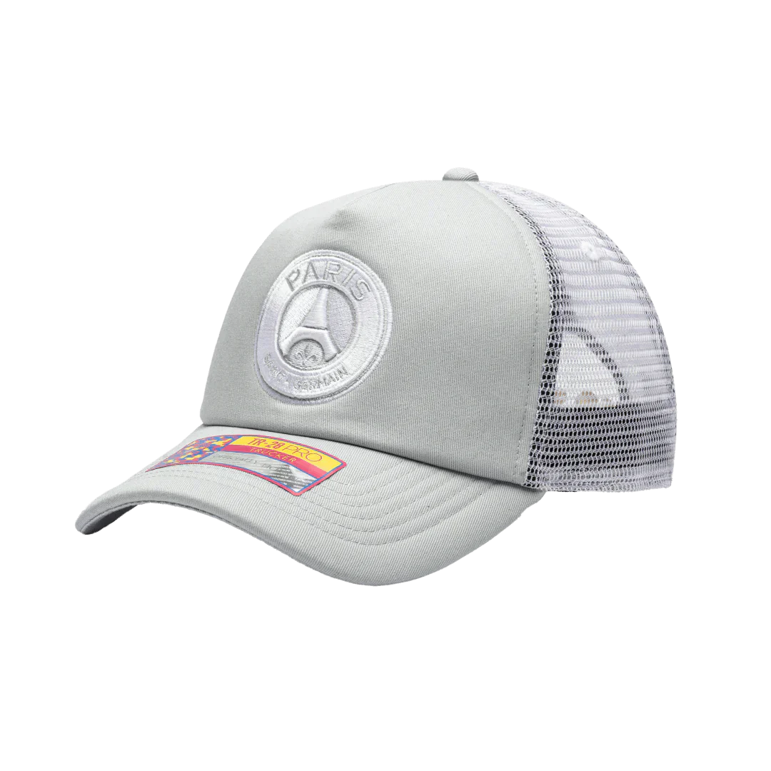 The Paris Saint-Germain Fog Trucker Hat features a front 3D embroidery of the team logo and a sonic weld suede wrap on the back. The logo is embroidered in white to let your team logo pop on the hat. This hat also features a mesh back for a different look.