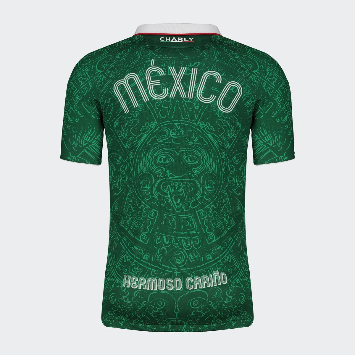 The Heritage Jersey’s base is a dark green-cyan shade overlaid with a design inspired by the Aztec Calendar in a lighter shade of green. The sublimation work gives the jersey a clean look from afar but is an exquisite statement piece when seen up close. The front of the jersey features Tonatiuh, the Aztec solar deity of the daytime sun, and the back features an oversized “MEXICO” word mark where a player’s last name would typically be placed. This placement is purposeful and an effort to unite everyone who wears the jersey behind Mexican lineage. The lower hem on the back of the jersey features the heartfelt phrase “Hermoso Carino,” the title of a 1971 song released by the famous Mexican ranchera singer Vicente Fernandez. The phrase has since become a part of Mexican culture and is often used to describe the concept of love.