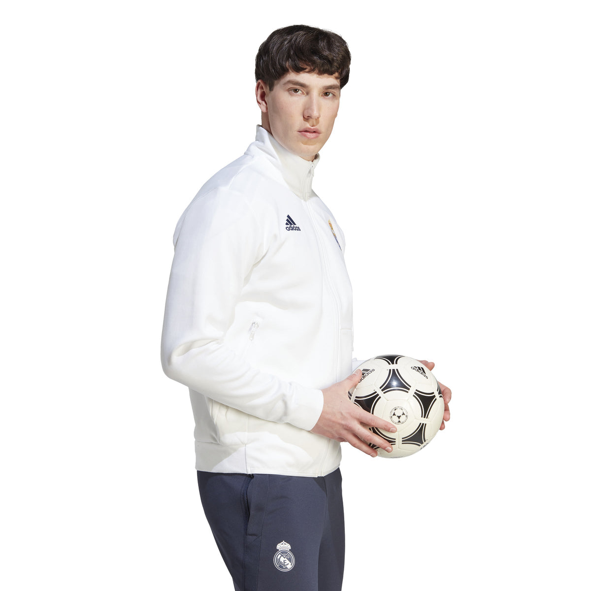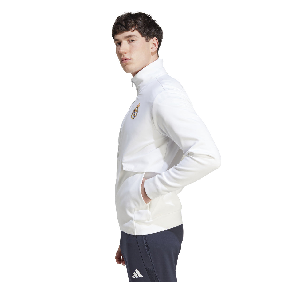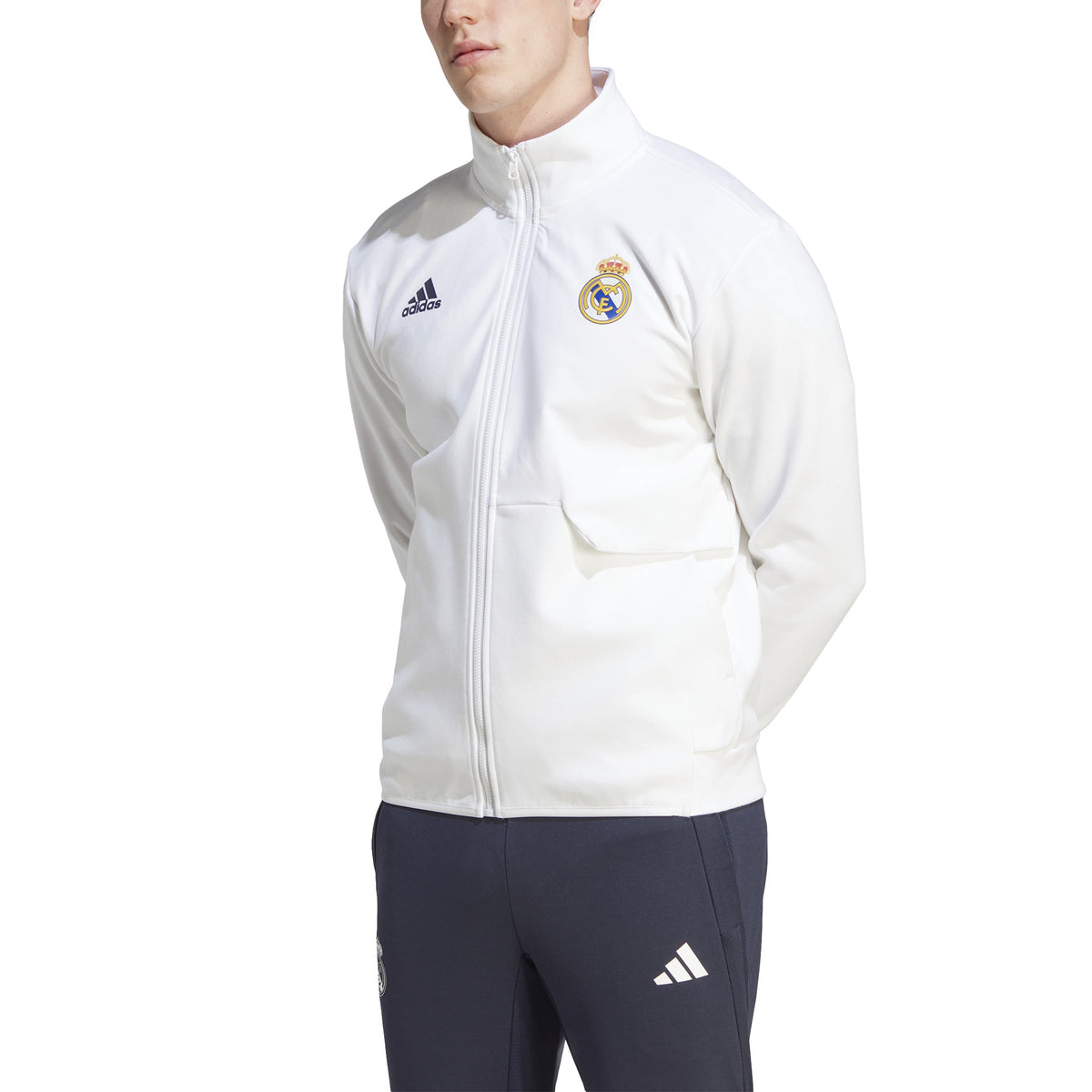 When the pros suit up and head onto the pitch the Real Madrid Anthem Jacket is a sign that world-class talent has entered the arena. With its sleek design and pure club colors, the stylish jacket lets you take the match-day winning mentality wherever you go. Simple and elegant, a classic all-white base is used as the foundation for a full-color crest at the chest, alongside a black adidas logo on the opposite side. One zip pocket and one slip-in pocket ensures space to keep your valuables secure, while the stand-up collar and full-zip is a stylish buffer against the elements. The result? A look that says Real Madrid through and through. 63% Cotton/37% rec polyester