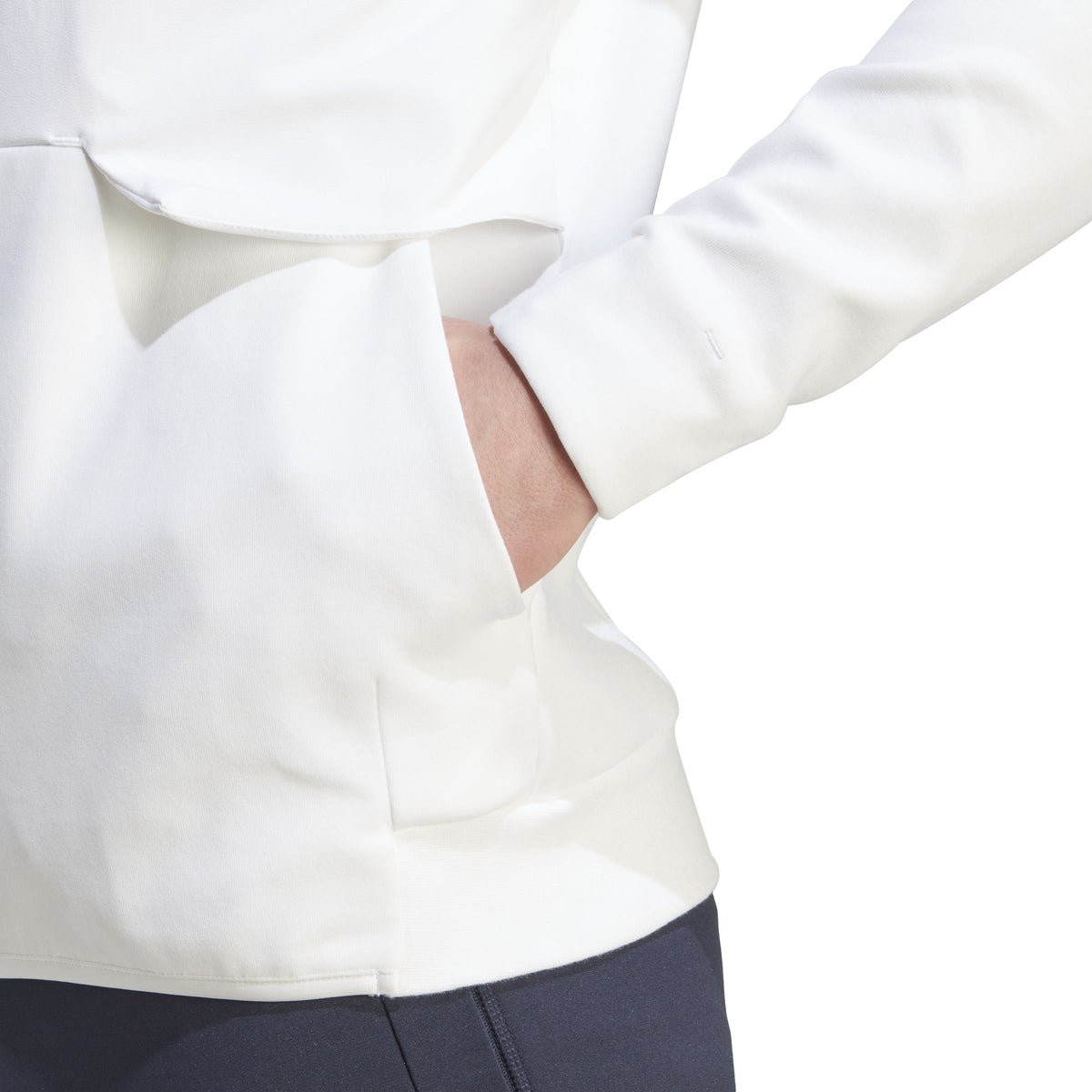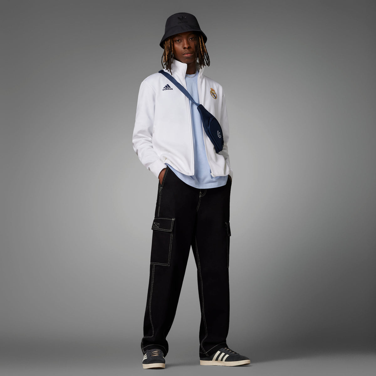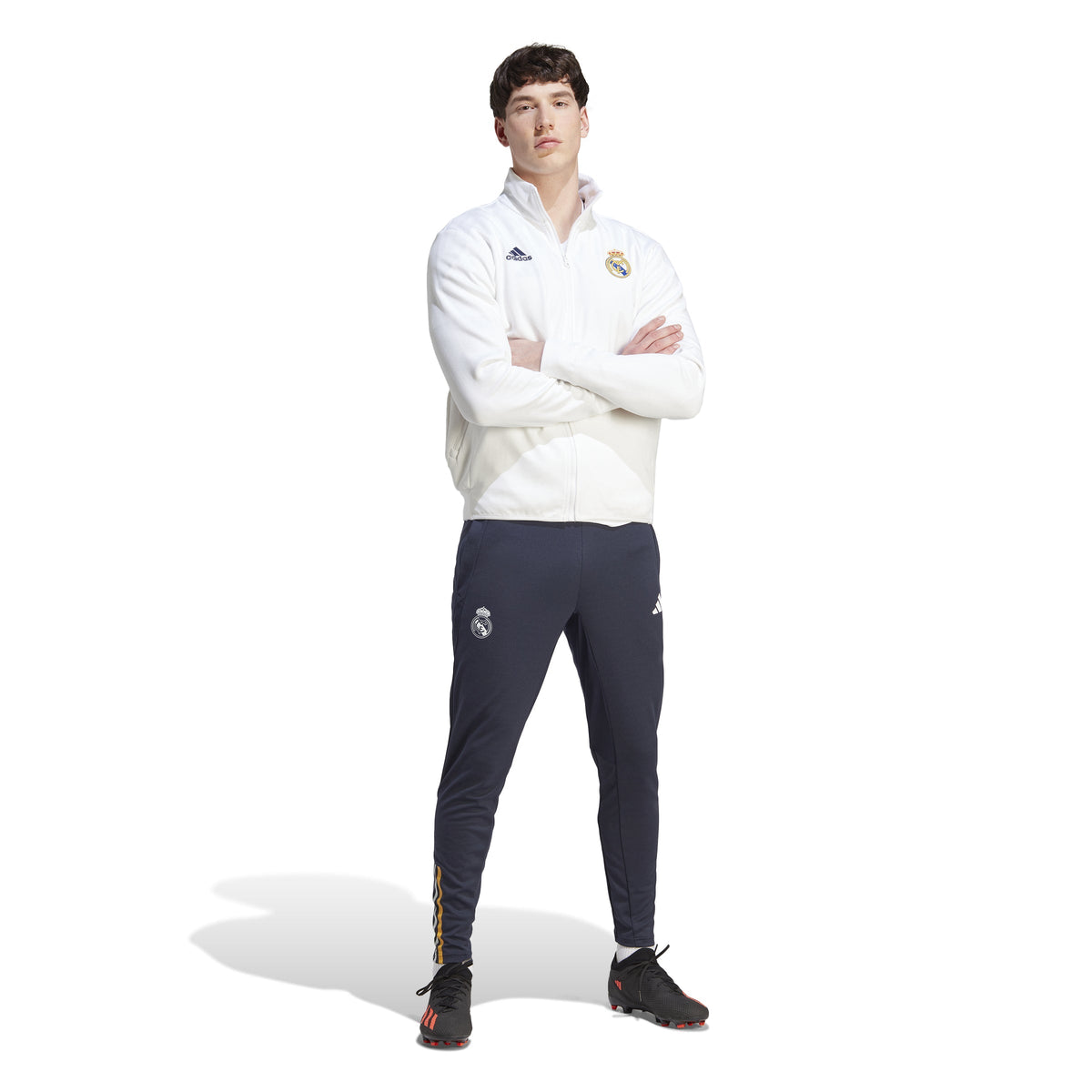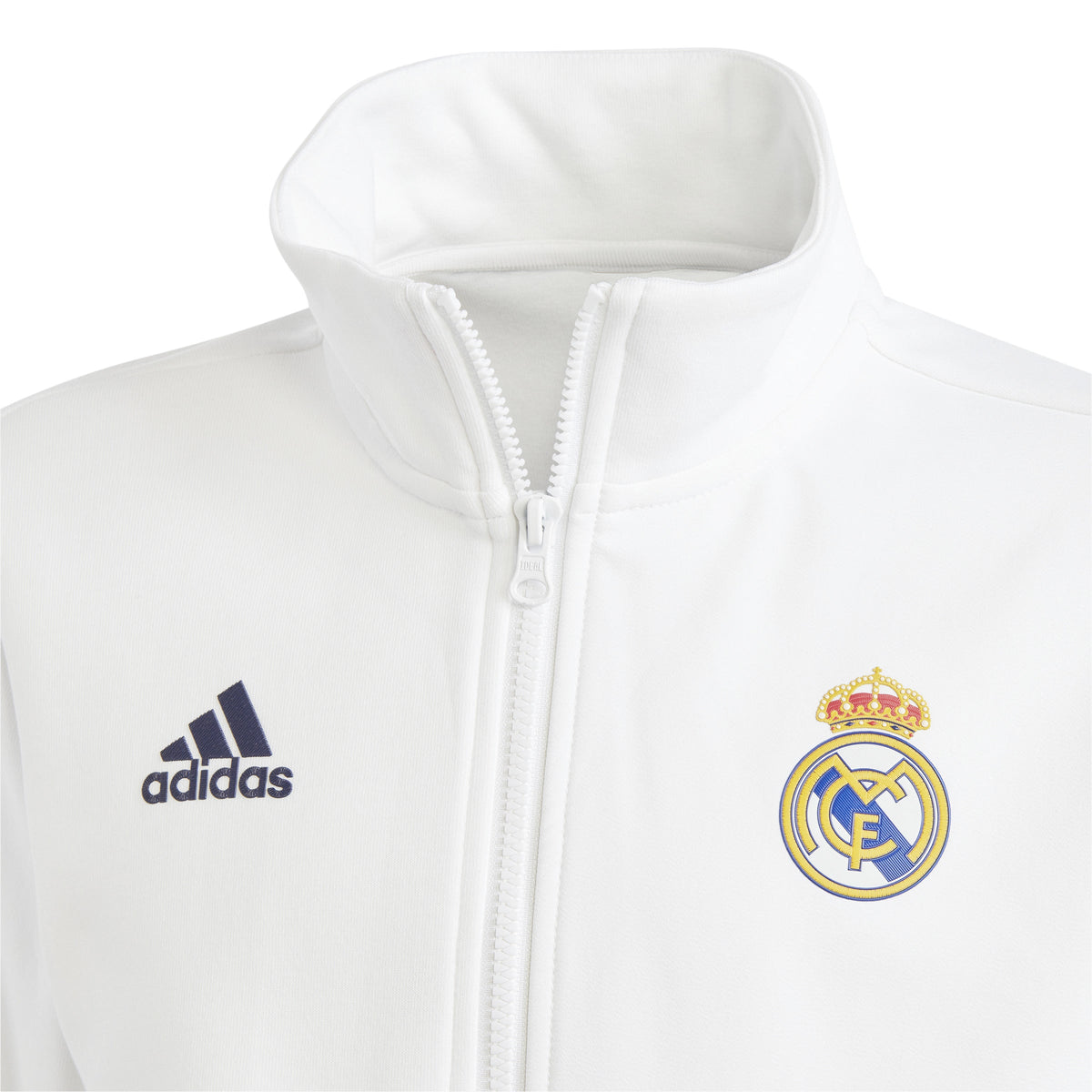 When the pros suit up and head onto the pitch the Real Madrid Anthem Jacket is a sign that world-class talent has entered the arena. With its sleek design and pure club colors, the stylish jacket lets you take the match-day winning mentality wherever you go. Simple and elegant, a classic all-white base is used as the foundation for a full-color crest at the chest, alongside a black adidas logo on the opposite side. One zip pocket and one slip-in pocket ensures space to keep your valuables secure, while the stand-up collar and full-zip is a stylish buffer against the elements. The result? A look that says Real Madrid through and through. 63% Cotton/37% rec polyester