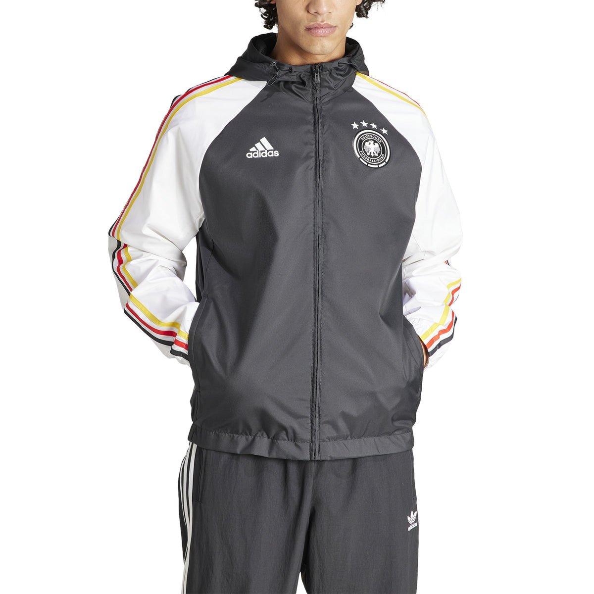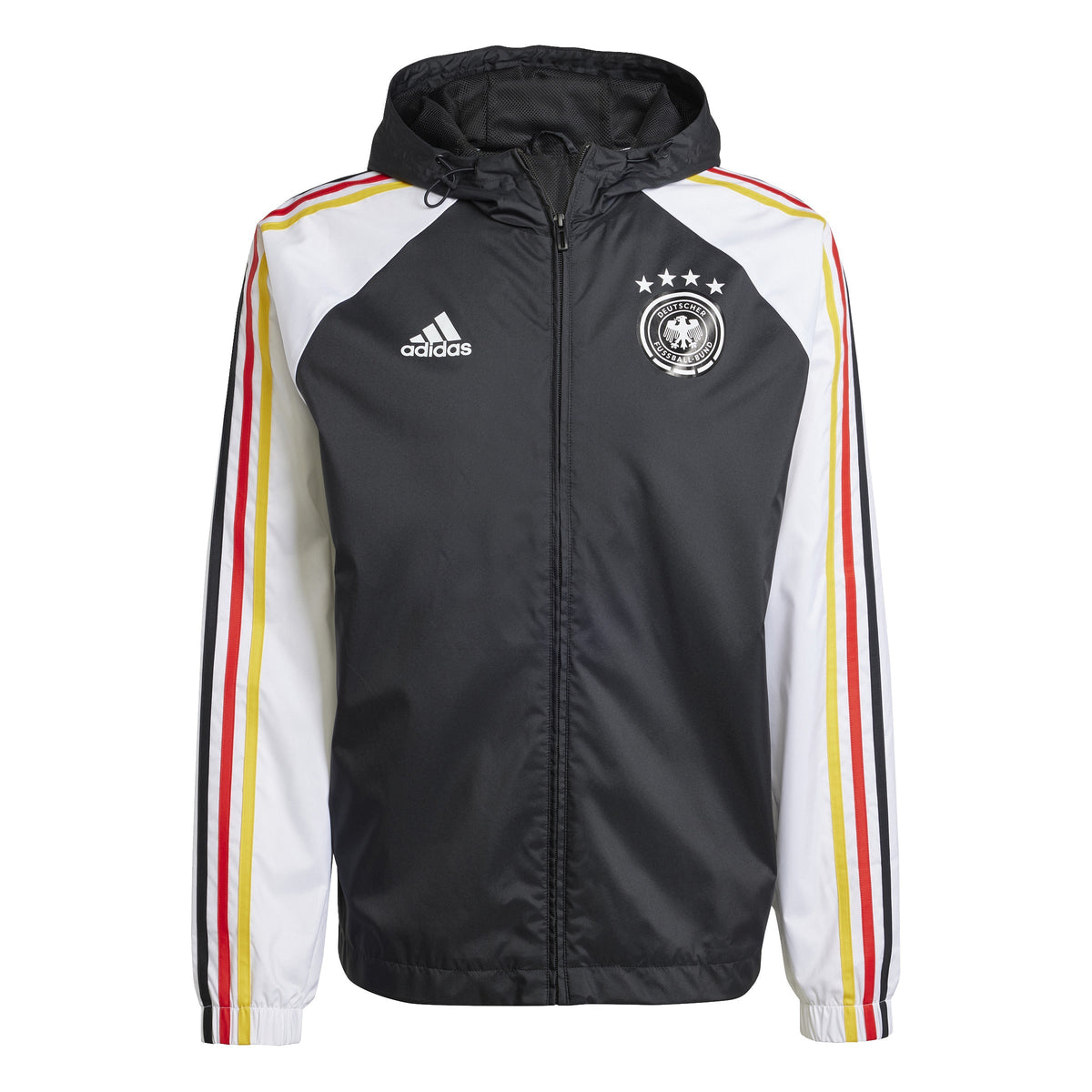 Stay protected from the elements with the adidas Germany DNA Windbreaker. This lightweight jacket is designed with an adjustable hood for snug coverage. Wind-resistant fabric helps keep you warm, while signature adidas branding adds official style. Stay comfortable and protected no matter the weather.